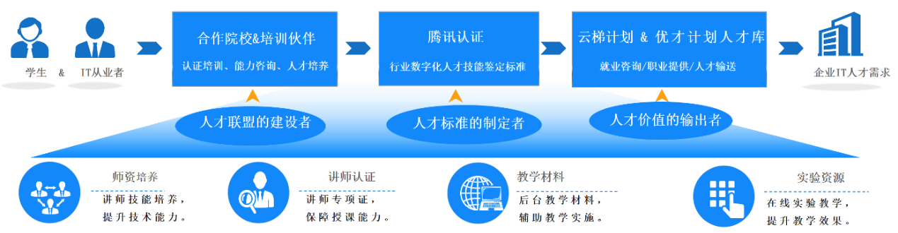 深圳信息职业技术学院软件学院把握“云智融合”新趋势,紧密对接深圳战略性新兴产业,创新校企合作模式,持续探索现代职业教育人才培养机制,依托湾区职教产教联盟、W3C、行业协会,携手腾讯找准利益共赢点,建设特色“云智产业学院”,推动基于领军及生态圈企业用工需求的人才共育、基于领军企业平台新技术的资源共建共用、基于核心技术支持的专本一体化实践实训条件共建、面向领军企业新技术的培训及推广、面向生态小微企业应用需求的联合攻关、面向新技术产品孵化的成果转化等全方位的分层分类合作,打造校企共生共长的命运共同体。探索以腾讯云为依托的产教深融的特色办学模式,通过课证赛融通的方式,引入企业认证、教育部1+X认证及人社部人才技能认证等证书相关培训内容,打造围绕认证内容相关的实习实训中心,辅以省级或国家级、行业型职业技能赛事服务,全方位拓宽人才输出渠道,如图6所示。