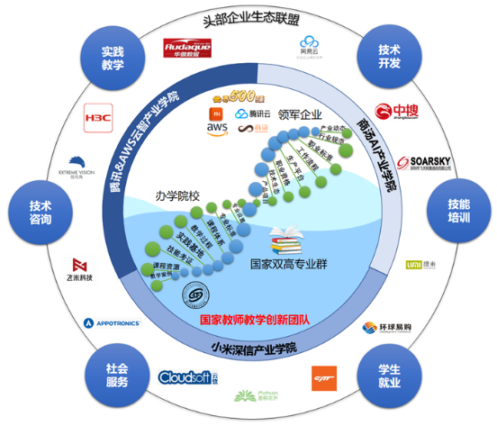 以“头部企业+生态”模式建设产业学院,高质量育人平台促进产教深融通共发展。基于腾讯、亚马逊、小米等头部企业技术、平台、服务推广需求,探索出以新技术课程和实训案例为核心的教学资源及实践平台合作开发机制,驱动世界500强头部企业参与人才培养,逐步形成以头部企业为协同核心,以其生态联盟企业为协同面,以“头部企业+生态”模式建设产业学院,汇聚产业高端资源,推动新技术教学资源建设、新技术平台共建推广、产业技术联合攻关。针对粤港澳大湾区产业快速升级带来的新型软件人才的缺口,依托粤港澳大湾区职业教育产教联盟、国际万维网联盟(W3C)标准化组织与行业协会,携手世界500强头部企业并带动其生态联盟企业,建设“头部企业+生态”产业学院,在“产教孪生”的理念下实施校企双驱动的“人才培养+新技术推广+平台应用+技术服务”多元合作,整合校企双方优势资源,激活产教映射,高质量建设了腾讯&AWS云智产业学院、小米深信产业学院、商汤AI产业学院3个特色产业学院。