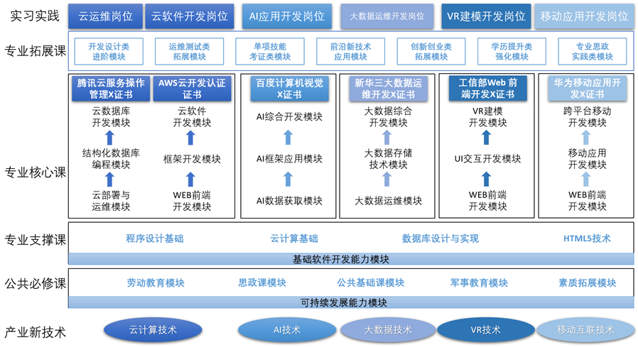 创新实施“微专业化”课程体系,提升人才培养质量。软件技术专业群按照产业逻辑,动态捕捉产业链新职业岗位群需求,以“微专业”动态组合新技术课程模块,驱动模块化教学改革和教学资源建设,提升人才培养与产业高端需求匹配度,提高软件技术专业群学生新技术岗位胜任力。面向云架构、AI和大数据等产业新业态,紧密对接头部企业,将产业链新职业岗位群技能要求和企业生产研发项目案例转化为教学要求和教学内容。校企双方共同制定职业化、活模块课程体系,完成新技术教学模块化解构,形成核心技能知识点和实训案例,课程团队分组负责建设并更新6大新技术课程模块,对接1+X证书实施课证融通。在“云智融合”技术发展趋势下,主动引领由传统局域网向全球公有云的软件开发人才培养变革,提炼新技术岗位群的核心技能,实施“微专业”化重塑课程体系,动态组合5-10门具有高阶性、交叉性、挑战度的新技术活模块课程,提升软件专业人才培养与云软件开发、AI应用开发、移动应用开发等就业职业发展需求之间的匹配度。通过“分级管理、责任到人、挂图作战、节点督办、专家把关”的管理机制,支撑“项目贯穿、分层递进、精细培养”人才培养模式,使学生快速达到新职业新岗位领域的工作技能要求,精准提升学生岗位胜任力。