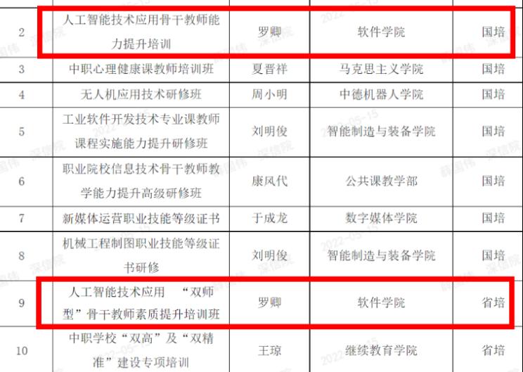 以国家教师教学创新团队为核心,积极开展国培省培等教师素质提升培训项目。软件技术专业群围绕“云智融合”产业开展育人工作,取得丰硕成果。为进一步示范引领职业教育发展,助力职业教育高素质、专业化“双师型”教师队伍建设,专业群以国家教师教学创新团队为核心,全国优秀教师、广东省教学名师、博导等知名学者教授参与,联合行业头部企业商汤、达观、亚马逊和腾讯等知名科技企业,主动申报、开展人工智能技术应用等领域的骨干教师素质提升培训,着力提升参训教师的理论水平、管理技巧及实操技能。通过实地调研知名企业,进一步开拓参训教师的国际化办学视野并深化对产教融合职教新模式的理解。