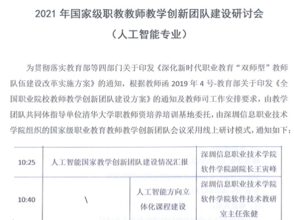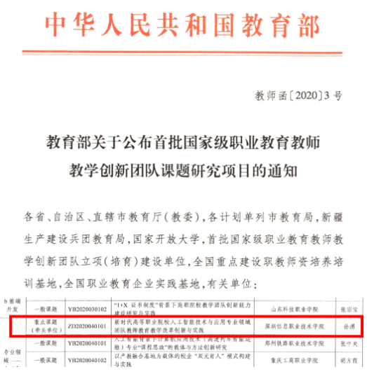 专业群获立项国家教师教学创新团队,开展国家教师教学创新团队重点课题研究。软件技术专业群坚持立德树人,高等职业教育办学成绩优秀,打造了一支德才兼备、教学能力突出、创新水平高的教师队伍。专业群建设成效显著,办学效果好,师资建设有示范引领效能,获教育部立项国家教师教学创新团队,并牵头开展人工智能领域重点课题研究工作。