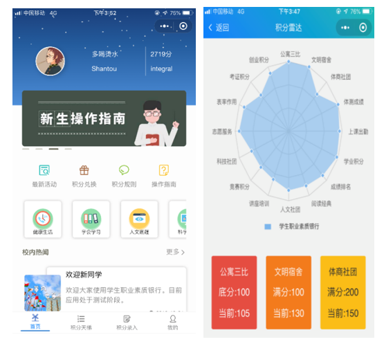“职业素质银行”微信小程序不仅记录学生在校期间素质成长,还将汇总全部数据,为学生自动生成一份个性化的图像简历。同时,记录了每一名大学生的成长轨迹,使得大学生日常管理工作更加精细化、科学化。作为学生“全生命周期”的数字量化管理系统,上线以来,在规范和引导学生日常生活、学习、校园活动、社会实践和就业择业等方面发挥了重要作用,更好发挥了通过强化过程管理和引导实现最佳成效的作用。